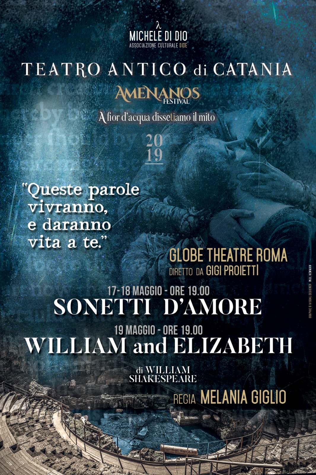 AMENANOS FESTIVAL – Teatro Antico di Catania:Sonetti d’Amore di William Shakespeare – venerdì 17 e sabato 18 maggio ore 19:00 – William and Elizabeth, chiuderà l’Amenanos Festival domenica 19 maggio alle ore 19:00.