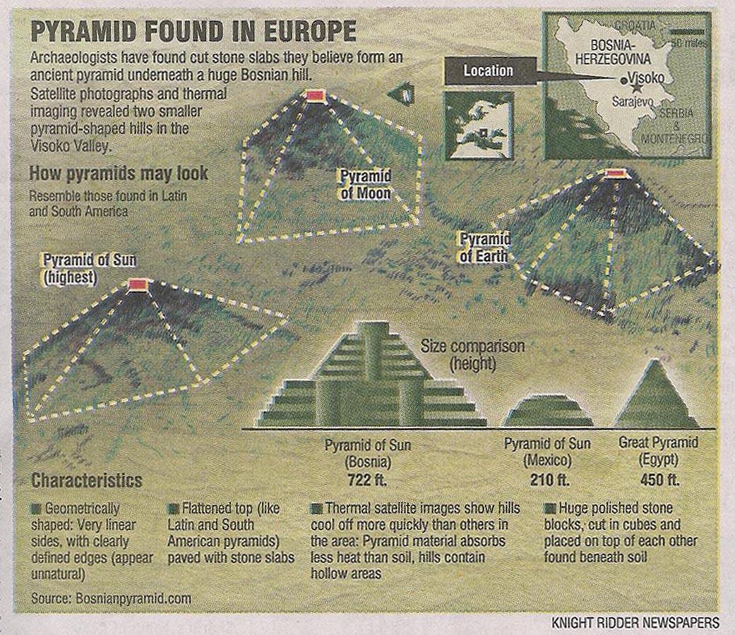 Se diamo un’occhiata in giro per il web, ci accorgiamo però che stanno venendo fuori nuove consapevolezze e, a quanto pare, di piramidi è pieno il mondo – e non solo l’Egitto o lo Yucatan, come sapevamo. Vi mostriamo dunque un documento di Siusy Blady che, per quanto tratti la materia con ironia e con beneficio di verifica e inventario, tuttavia non è certo una sprovveduta… avvertendo che contro la tesi delle piramidi bosniache, sostenuta da Semir Osmanagic, il personaggio intervistato, vi sono molte critiche, tra cui il professor Sejfudin Vrabac della Facoltà di Mineralogia e geologia dell’ Università di Tuzla che sostengono che la collina è una semplice formazione geologica naturale.