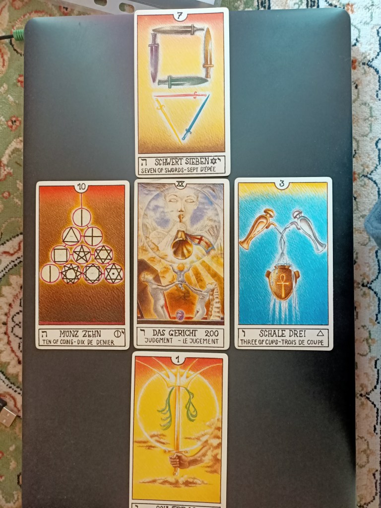 La carta in basso, situazione attuale, vede apparire la radice dei poteri dell’Aria, la Spada, potere fulgido della Geburah, la scintillante lama dinanzi alla quale nessuna menzogna può perdurare. A sinistra il passato, il cui emblema è dato dai Dieci Scudi, una situazione che ha germogliato ed ha prodotto benessere, giungendo al suo culmine e che, per continuare, per non decadere, deve andare oltre il suo limite materiale. In alto, i fattori intervenienti si manifestano nella forma di Sette Spade, indicando i sette raggi della personalità: tre per parte ed una spada al centro, allineata e perpendicolare alla Spada della Geburah, significando la necessità di assumere stabilmente il controllo di sé. Il futuro prende l’immagine delle Tre Coppe, che confermano permanenza di Colui che era, che è e che sarà. Promette abbondanza: a condizione di non perdersi nelle piccole cose.