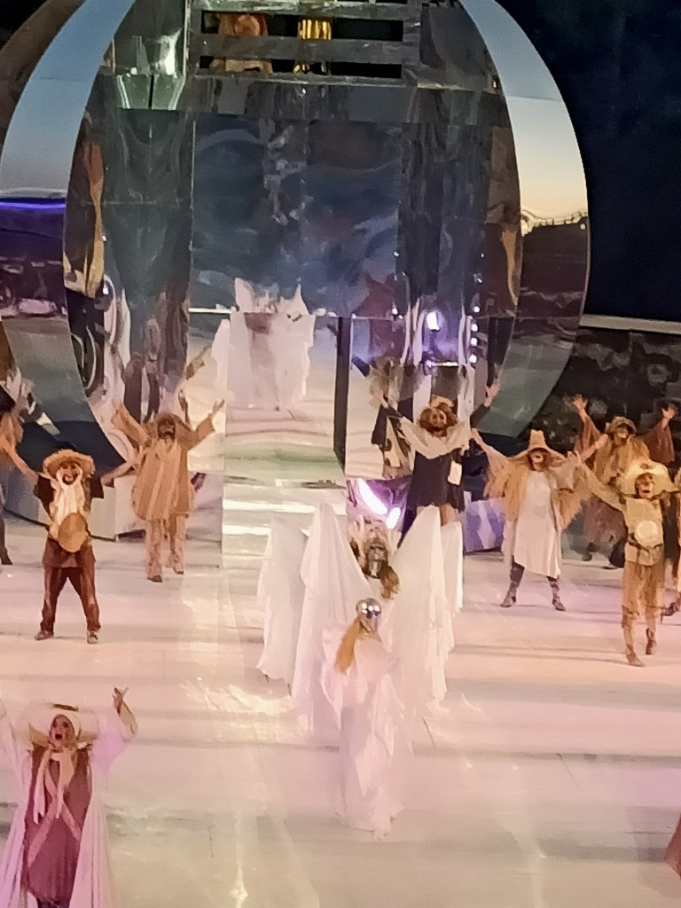 Non è questa l’unica invenzione dello spettacolo: si potrebbe far menzione del braccio meccanico che pone in volo l’insetto che porta Trigeo (Giuseppe Battiston), il protagonista umano, nel mondo degli dèi – che però hanno traslocato da poco, lasciando solo un improbabile Hermes (Massimo Verdastro) per gli ultimi dettagli. A questa invenzione sul registro comico corrisponde l’altra parte, con la pace ritrovata che diventa occasione di un banchetto che reinterpreta i sacrifici sacri in modo inadeguato e volgare. Questa sequenza innesta l’inconciliabilità tra mondo antico e mondo moderno, e tutta l’insufficienza del nostro pensare contemporaneo. Uomini mascherati in giacca e cravatta irrompono avidamente sulla scena; un venditore d’armi lamenta la sua crisi economica. Il popolo contadino della gente onesta cerca di capire, ma non ha le basi. La scena evoca l’immagine del celebre quadro Il Quarto Stato di Pelizza da Volpedo ma vede questo contado privo di ogni convinzione e consapevolezza ed infine appare un tavolo colmo di bandiere, speranzuccia che fa pensare all’ONU e alla debolezza delle sue risoluzioni, come il monologo finale della dea (Elena Poli Greco) ammette, comunque esile filo di una possibile pace futura e duratura.