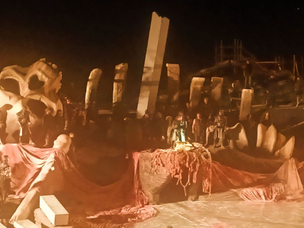 La scena, che sembrava semplice, tolti i teli, si rivela come una enorme e costosa carcassa di ossa, scheletro di un ipotetico enorme uomo che pervade il profilo del monte e del mondo intero: Aiace sta per darsi la morte. Lo ha fatto, e per sempre. Finisce un mondo antico, di cui lo scheletro iper-realista rimanda all’estinzione di un’antica e gigantesca specie.