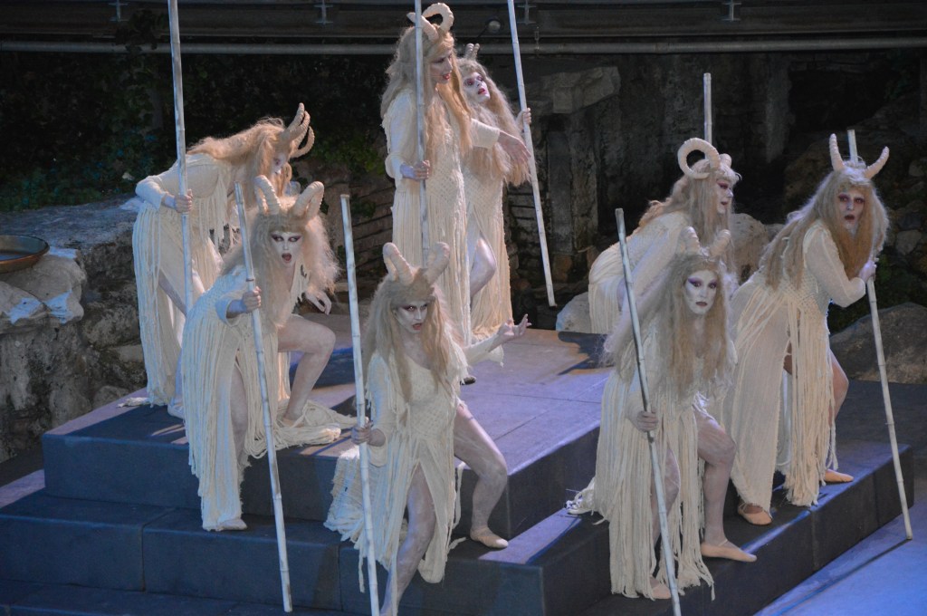 Spesso si dice di questa tragedia che il Coro (Elena Aimone, Cinzia Cordelia, Maria Chiara Centorami, Marcella Favilla, Carlotta Mangione, Silvia Pietta, Odette Piscitelli, Elisa Zucchetti) è il vero protagonista. La messa in scena di Daniele Salvo è perfetta per restituire questo significato poiché, senza rinunciare ai momenti virtuosi degli attori, costituisce un movimento coreutico che vuole essere ferino; un sentire animale che è nei movimenti del branco, con mimesi panica e sensuale che porta il climax dell’illusione al punto più elevato da cui comincia il disvelamento e dunque la tragedia.