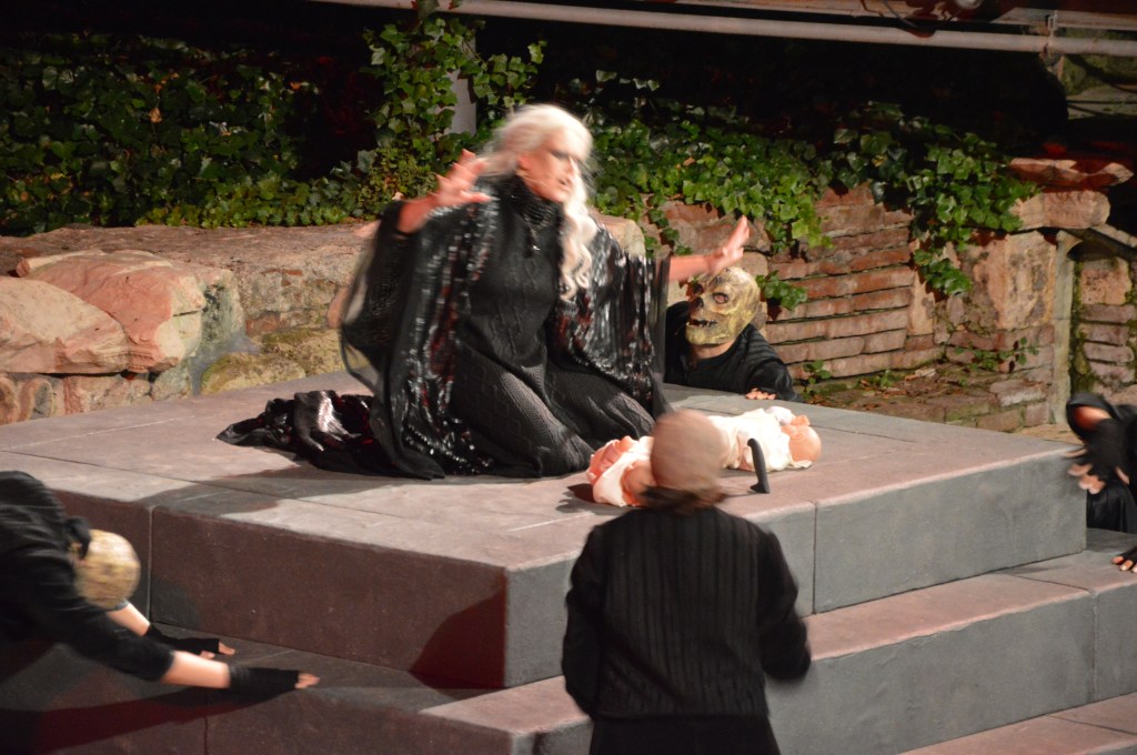 Melania Giglio è una sfinge che canta. Il ruolo di Medea è perfetto per lei. Lo divora e ne è divorata. Attraverso questa autofagia, la sua Medea si trasforma continuamente. Le influenze shakespeariane si sentono quando il personaggio muta atteggiamento in funzione del potere, come una Lady Macbeth. O Gonerilla. Medea le trascende entrambe quando passa all’evocazione di Ecate, la Luna Assente, divinità segreta che si nasconde nel nome della città. Per intuizione indotta, il Teatro Antico di Catania in qualche istante rivela al pubblico tutti i suoi secoli. Il testo di Seneca evoca le potenze sotterranee, i recessi dell’Etna, Scilla e Cariddi, le forze oscure tutte. La voce di Melania non si limita a dire: attinge agli infrasuoni, e vaga a lungo e a più riprese dov’è la sede dello spirito della tragedia. Fino alle viscere, fino a non comprendere più qual è il confine tra lei stessa e le creature cui ha dato vita, in un unico desiderio di eternità, un per sempre rovesciato nell’annientamento.