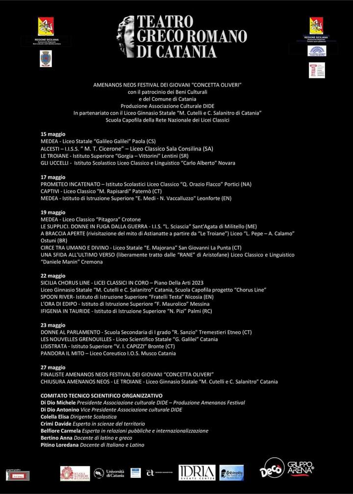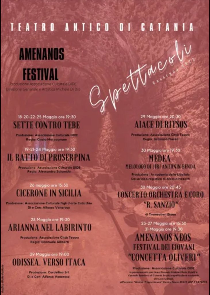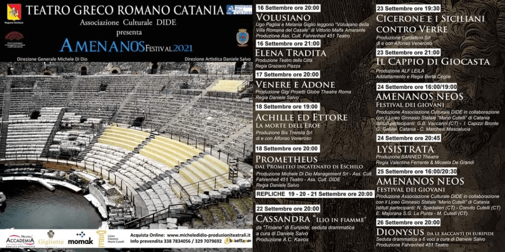 LA SETTIMANA DEL TEATRO ANTICO (Amenanos Festival, Amenanos Neos per i Giovani) nasce a Catania in quella porzione di centro storico di impianto settecentesco, che intercetta resti di edifici di epoca romana, di grande bellezza ma spesso non valorizzati e in situazione asfittica: Il TEATRO ANTICO di via Vittorio Emanuele, nascosto alla vista per larga misura, è il paradigma di questa situazione e ne costituisce il punto di partenza del progetto in quanto PATTO DI COMUNITÀ per la rigenerazione del territorio attraverso la promozione dei saperi, assumendo come punto di partenza l’introduzione del teatro come strumento didattico per le Scuole, offrendo un punto di aggancio nel contesto fisico del teatro antico.